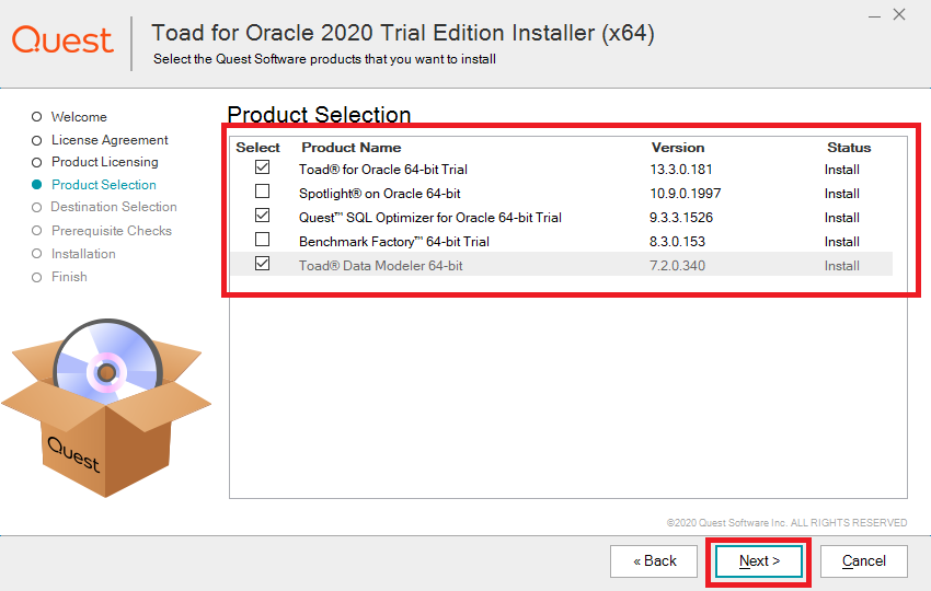 6. Ceklis product yang dibutuhkan untuk instalasi, ikuti seperti gambar berikut jika anda tidak membutuhkan Spotlight dan Benchmark Factory